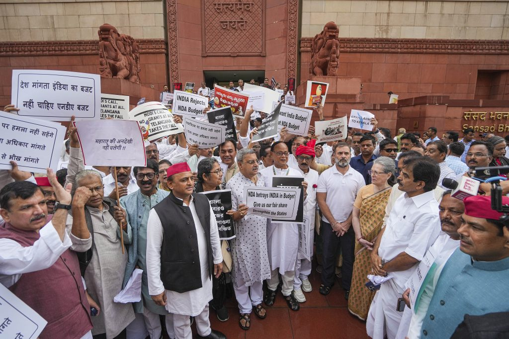 ‘ਇੰਡੀਆ’ ਗੱਠਜੋੜ ਨਾਲ ਜੁੜੇ ਸੰਸਦ ਮੈਂਬਰਾਂ ਨੇ ਕੇਂਦਰੀ ਬਜਟ ਵਿੱਚ ਵਿਰੋਧੀ ਧਿਰ ਦੀ ਨੁਮਾਇੰਦਗੀ ਵਾਲੇ ਸੂਬਿਆਂ ਨਾਲ ਭੇਦਭਾਵ ਰੱਖਣ ਦਾ ਆਰੋਪ ਲਾਉਂਦਿਆਂ ਸੰਸਦ ਭਵਨ ਦੇ ਬਰਾਮਦੇ ਵਿਚ ਵਿਰੋਧ ਪ੍ਰਦਰਸ਼ਨ ਕੀਤਾ। ਇਸ ਵਿਰੋਧ ਪ੍ਰਦਰਸ਼ਨ ਵਿਚ ਕਾਂਗਰਸ ਪਾਰਟੀ ਦੇ ਪ੍ਰਧਾਨ ਮਲਿਕਾਰਜੁਨ ਖੜਗੇ, ਲੋਕ ਸਭਾ ’ਚ ਵਿਰੋਧੀ ਧਿਰ ਦੇ ਆਗੂ ਰਾਹੁਲ ਗਾਂਧੀ ਅਤੇ ਸਮਾਜਵਾਦੀ ਪਾਰਟੀ ਦੇ ਮੁਖੀ ਅਖਿਲੇਸ਼ ਯਾਦਵ ਸਮੇਤ ਵਿਰੋਧੀ ਧਿਰ ਦੇ ਕਈ ਸੰਸਦ ਮੈਂਬਰ ਸ਼ਾਮਲ ਹੋਏ ਅਤੇ ਕੇਂਦਰ ਸਰਕਾਰ ਖ਼ਿਲਾਫ਼ ਨਾਅਰੇਬਾਜ਼ੀ ਕੀਤੀ। ਵਿਰੋਧੀ ਧਿਰਾਂ ਦੇ ਸੰਸਦ ਮੈਂਬਰਾਂ ਨੇ ਕੇਂਦਰ ਸਰਕਾਰ ’ਤੇ ਆਰੋਪ ਲਗਾਉਂਦਿਆਂ ਕਿਹਾ ਕਿ ਕਿਸੇ ਨੂੰ ਵੀ ਇਨਸਾਫ਼ ਨਹੀਂ ਮਿਲਿਆ ਅਤੇ ਨਾ ਹੀ ਬਿਹਾਰ ਤੇ ਆਂਧਰਾ ਪ੍ਰਦੇਸ਼ ਨੂੰ ਵਿਸ਼ੇਸ਼ ਰਾਜ ਦਾ ਦਰਜਾ ਮਿਲਿਆ ਹੈ। ਜ਼ਿਕਰਯੋਗ ਹੈ ਖੜਗੇ ਦੇ ਘਰ ਹੋਈ ਇੰਡੀਆ ਗੱਠਜੋੜ ਦੇ ਆਗੂਆਂ ਦੀ ਬੈਠਕ ਦੌਰਾਨ ਸੰਸਦ ਦੇ ਅੰਦਰ ਅਤੇ ਬਾਹਰ ਵਿਰੋਧ ਜਤਾਉਣ ਦਾ ਫੈਸਲਾ ਕੀਤਾ ਗਿਆ ਸੀ।