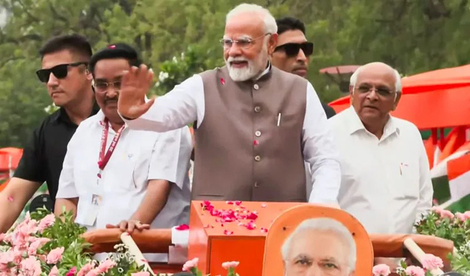 ਪ੍ਰਧਾਨ ਮੰਤਰੀ ਨਰਿੰਦਰ ਮੋਦੀ ਨੇ ਅੱਜ ਮੰਗਲਵਾਰ ਸਵੇਰੇ ਗੁਜਰਾਤ ਦੇ ਗਾਂਧੀਨਗਰ ਵਿਚ ਮੈਗਾ ਰੋਡ ਸ਼ੋਅ ਕੱਢਿਆ। ਪ੍ਰਧਾਨ ਮੰਤਰੀ ਦੇ ਦੋ ਦਿਨਾਂ ਗੁਜਰਾਤ ਦੌਰੇ ਦੌਰਾਨ ਇਹ ਚੌਥਾ ਰੋਡ ਸ਼ੋਅ ਸੀ। ਜੰਮੂ ਕਸ਼ਮੀਰ ਵਿਚ ਪਹਿਲਗਾਮ ਦਹਿਸ਼ਤੀ ਹਮਲੇ ਨੂੰ ਲੈ ਕੇ ਭਾਰਤ ਦੀ ਅਪਰੇਸ਼ਨ ਸੰਦੂਰ ਤਹਿਤ ਫੌਜੀ ਕਾਰਵਾਈ ਮਗਰੋਂ ਪੀਐਮ ਮੋਦੀ ਦਾ ਆਪਣੇ ਪਿੱਤਰੀ ਸੂਬੇ ’ਚ ਇਹ ਪਹਿਲਾ ਰੋਡ ਸ਼ੋਅ ਸੀ। ਇਹ ਰੋਡ ਸ਼ੋਅ ਗਾਂਧੀ ਨਗਰ ਦੇ ਰਾਜ ਭਵਨ ਤੋਂ ਸ਼ੁਰੂ ਹੋਇਆ ਅਤੇ ਮਹਾਤਮਾ ਮੰਦਰ ਵਿਖੇ ਸਮਾਪਤ ਹੋਇਆ। ਇਸ ਮੌਕੇ ਸੜਕ ਦੇ ਦੋਵੇਂ ਪਾਸੇ ਵੱਡੀ ਗਿਣਤੀ ਲੋਕ ਇਕੱਠੇ ਹੋਏ ਅਤੇ ਤਿਰੰਗਾ ਲਹਿਰਾਉਂਦੇ ਦੇਖੇ ਗਏ। ਧਿਆਨ ਰਹੇ ਕਿ ਪ੍ਰਧਾਨ ਮੰਤਰੀ ਮੋਦੀ ਨੇ ਲੰਘੇ ਕੱਲ੍ਹ ਸੋਮਵਾਰ ਨੂੰ ਵਡੋਦਰਾ, ਭੁਜ ਅਤੇ ਅਹਿਮਦਾਬਾਦ ਵਿਚ ਵੀ ਰੋਡ ਸ਼ੋਅ ਕੀਤੇ ਸਨ। ਪ੍ਰਧਾਨ ਮੰਤਰੀ ਮੋਦੀ ਨੇ ਪਾਕਿਸਤਾਨ ’ਚ ਕੀਤੇ ਗਏ ਅਪਰੇਸ਼ਨ ਸੰਦੂਰ ਬਾਰੇ ਗੱਲ ਕਰਦਿਆਂ ਕਿਹਾ ਕਿ ਅਸੀਂ ਦਹਿਸ਼ਤਵਾਦ ਦੇ 9 ਟਿਕਾਣੇ ਤਹਿ ਕਰਕੇ 22 ਮਿੰਟ ਵਿਚ ਉਨ੍ਹਾਂ ਤਬਾਹ ਕੀਤਾ ਹੈ।
