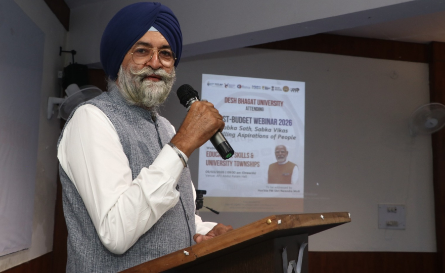 ਮੰਡੀ ਗੋਬਿੰਦਗੜ੍ਹ, 18 ਮਾਰਚ: ਦੇਸ਼ ਭਗਤ ਯੂਨੀਵਰਸਿਟੀ ਦੇ ਮੈਨੇਜਮੈਂਟ ਅਤੇ ਕਾਮਰਸ ਵਿਭਾਗ ਨੇ ਸੰਸਥਾ ਦੀ ਇਨੋਵੇਸ਼ਨ ਕੌਂਸਲ (IIC) ਅਤੇ IQAC ਦੇ ਸਹਿਯੋਗ ਨਾਲ, ਸਿੱਖਿਆ ਮੰਤਰਾਲੇ ਦੁਆਰਾ ਆਯੋਜਿਤ ਪੋਸਟ-ਬਜਟ ਵੈਬੀਨਾਰ 2026 ਵਿੱਚ ਸਰਗਰਮੀ ਨਾਲ ਹਿੱਸਾ ਲਿਆ।