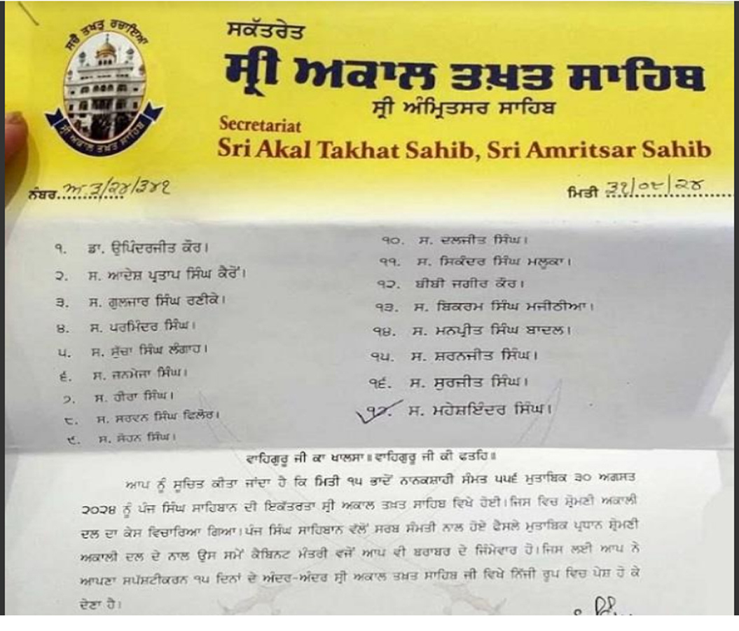 ਪੰਜਾਬ ਵਿਚ ਅਕਾਲੀ ਦਲ ਦੀ ਸਰਕਾਰ ਸਮੇਂ ਦੇ 17 ਸਾਬਕਾ ਮੰਤਰੀਆਂ ਤੋਂ ਸ੍ਰੀ ਅਕਾਲ ਤਖਤ ਸਾਹਿਬ ਨੇ ਸਪੱਸ਼ਟੀਕਰਨ ਮੰਗਿਆ ਹੈ। ਇਸ ਨੂੰ ਲੈ ਕੇ ਸ੍ਰੀ ਅਕਾਲ ਤਖਤ ਸਾਹਿਬ ਵਲੋਂ ਇਕ ਚਿੱਠੀ ਜਨਤਕ ਕਰ ਦਿੱਤੀ ਗਈ ਹੈ। ਜਿਸ ਵਿਚ ਅਕਾਲੀ ਸਰਕਾਰ ਦੇ ਕਾਰਜਕਾਲ ਦੌਰਾਨ ਮੰਤਰੀ ਰਹੇ 17 ਵਿਅਕਤੀਆਂ ਕੋਲੋਂ ਸਪੱਸ਼ਟੀਕਰਨ ਮੰਗਿਆ ਗਿਆ ਹੈ। ਜਿਨ੍ਹਾਂ ਸਾਬਕਾ ਮੰਤਰੀਆਂ ਕੋਲੋਂ ਸਪੱਸ਼ਟੀਕਰਨ ਮੰਗਿਆ ਗਿਆ ਹੈ ਉਨ੍ਹਾਂ ਵਿਚ ਬੀਬੀ ਉਪਿੰਦਰਜੀਤ ਕੌਰ, ਆਦੇਸ਼ ਪ੍ਰਤਾਪ ਸਿੰਘ ਕੈਰੋਂ, ਗੁਲਜ਼ਾਰ ਸਿੰਘ ਰਣੀਕੇ, ਪਰਮਿੰਦਰ ਸਿੰਘ ਢੀਂਡਸਾ, ਸੁੱਚਾ ਸਿੰਘ ਲੰਗਾਹ, ਜਨਮੇਜਾ ਸਿੰਘ ਸੇਖੋਂ ਅਤੇ ਹੀਰਾ ਸਿੰਘ ਗਾਬੜੀਆ ਸ਼ਾਮਲ ਹਨ। ਇਸੇ ਤਰ੍ਹਾਂ ਸਰਵਨ ਸਿੰਘ ਫਿਲੌਰ, ਸੋਹਣ ਸਿੰਘ ਠੰਡਲ, ਦਲਜੀਤ ਸਿੰਘ ਚੀਮਾ, ਸਿਕੰਦਰ ਸਿੰਘ ਮਲੂਕਾ, ਬੀਬੀ ਜਗੀਰ ਕੌਰ, ਬਿਕਰਮ ਸਿੰਘ ਮਜੀਠੀਆ, ਮਨਪ੍ਰੀਤ ਸਿੰਘ ਬਾਦਲ, ਸ਼ਰਨਜੀਤ ਸਿੰਘ ਢਿੱਲੋਂ, ਸੁਰਜੀਤ ਸਿੰਘ ਅਤੇ ਮਹੇਸ਼ਇੰਦਰ ਸਿੰਘ ਗਰੇਵਾਲ ਦਾ ਨਾਮ ਵੀ ਇਸ ਚਿੱਠੀ ਵਿਚ ਸ਼ਾਮਲ ਹੈ। ਜ਼ਿਕਰਯੋਗ ਹੈ ਕਿ 2007 ਤੋਂ 2017 ਤੱਕ ਅਕਾਲੀ ਸਰਕਾਰ ਸਮੇਂ ਪੰਜਾਬ ਵਿਚ ਪੰਥ ਨੂੰ ਨੁਕਸਾਨ ਪਹੁੰਚਾਉਣ ਵਾਲੀਆਂ ਵਾਪਰੀਆਂ ਘਟਨਾਵਾਂ ਕਰਕੇ ਸੁਖਬੀਰ ਸਿੰਘ ਬਾਦਲ ਨੂੰ ਪੰਜ ਸਿੰਘ ਸਾਹਿਬਾਨਾਂ ਦੀ ਮੀਟਿੰਗ ਦੌਰਾਨ ਤਨਖਾਹੀਆ ਕਰਾਰ ਦਿੱਤਾ ਗਿਆ ਸੀ। ਇਸਦੇ ਨਾਲ ਹੀ ਉਸ ਸਮੇਂ ਦੇ 17 ਮੰਤਰੀਆਂ ਕੋਲੋਂ ਵੀ 15 ਦਿਨਾਂ ਦੇ ਅੰਦਰ-ਅੰਦਰ ਸਪੱਸ਼ਟੀਕਰਨ ਮੰਗਿਆ ਗਿਆ ਹੈ। ਧਿਆਨ ਰਹੇ ਕਿ ਡਾ. ਦਲਜੀਤ ਸਿੰਘ ਚੀਮਾ, ਗੁਲਜ਼ਾਰ ਸਿੰਘ ਰਣੀਕੇ, ਸ਼ਰਨਜੀਤ ਸਿੰਘ ਢਿੱਲੋਂ ਅਤੇ ਮਹੇਸ਼ਇੰਦਰ ਸਿੰਘ ਗਰੇਵਾਲ ਵਲੋਂ ਆਪਣਾ ਸਪੱਸ਼ਟੀਕਰਨ ਅਕਾਲ ਤਖਤ ਸਾਹਿਬ ਦੇ ਦਫਤਰ ਵਿਖੇ ਸੌਂਪ ਦਿੱਤਾ ਗਿਆ ਹੈ ਅਤੇ ਬਾਕੀ ਸਾਬਕਾ ਮੰਤਰੀਆਂ ਦੇ ਸਪੱਸ਼ਟੀਕਰਨ ਦੀ ਉਡੀਕ ਕੀਤੀ ਜਾ ਰਹੀ ਹੈ।
