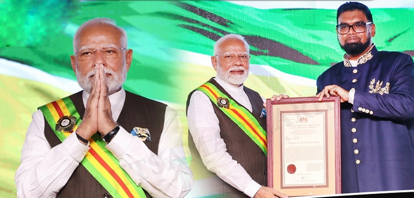 ਗੁਆਨਾ ਦੇ ਰਾਸ਼ਟਰਪਤੀ ਡਾ. ਇਰਫਾਨ ਅਲੀ ਨੇ ਪ੍ਰਧਾਨ ਮੰਤਰੀ ਨਰਿੰਦਰ ਮੋਦੀ ਨੂੰ ਜਾਰਜਟਾਊਨ ’ਚ ਦੇਸ਼ ਦੇ ਸਰਵਉੱਚ ਨਾਗਰਿਕ ਸਨਮਾਨ ‘ਆਰਡਰ ਆਫ ਐਕਸੀਲੈਂਸ’ ਨਾਲ ਸਨਮਾਨਿਤ ਕੀਤਾ। ਇਸ ਦੌਰਾਨ ਪ੍ਰਧਾਨ ਮੰਤਰੀ ਮੋਦੀ ਨੇ ਕਿਹਾ ਕਿ ਮੈਨੂੰ ਗੁਆਨਾ ਦੇ ਸਰਵਉੱਚ ਪੁਰਸਕਾਰ ਨਾਲ ਸਨਮਾਨਿਤ ਕਰਨ ਲਈ ਮੈਂ ਆਪਣੇ ਦੋਸਤ ਰਾਸ਼ਟਰਪਤੀ ਇਰਫਾਨ ਅਲੀ ਦਾ ਤਹਿ ਦਿਲੋਂ ਧੰਨਵਾਦ ਕਰਦਾ ਹਾਂ। ਉਨ੍ਹਾਂ ਕਿਹਾ ਕਿ ਇਹ ਸਨਮਾਨ ਸਿਰਫ ਮੇਰਾ ਹੀ ਨਹੀਂ, ਭਾਰਤ ਦੇ 140 ਕਰੋੜ ਲੋਕਾਂ ਦਾ ਸਨਮਾਨ ਹੈ। ਇਹ ਸਾਡੇ ਰਿਸ਼ਤੇ ਪ੍ਰਤੀ ਤੁਹਾਡੀ ਡੂੰਘੀ ਵਚਨਬੱਧਤਾ ਦਾ ਜਿਉਂਦਾ ਜਾਗਦਾ ਸਬੂਤ ਹੈ, ਜੋ ਸਾਨੂੰ ਹਰ ਖੇਤਰ ਵਿਚ ਅੱਗੇ ਵਧਣ ਦੀ ਪ੍ਰੇਰਨਾ ਦਿੰਦਾ ਰਹੇਗਾ। ਇਸੇ ਦੌਰਾਨ ਪ੍ਰਧਾਨ ਮੰਤਰੀ ਨਰਿੰਦਰ ਮੋਦੀ ਨੂੰ ਗੁਆਨਾ ਵਿਚ ਕੈਰੇਬੀਅਨ ਦੇਸ਼ ਡੋਮਿਨਿਕਾ ਵਲੋਂ ਵੀ ‘ਦ ਡੋਮਿਨਿਕਾ ਐਵਾਰਡ ਆਫ ਆਨਰ’ ਨਾਲ ਸਨਮਾਨਿਤ ਕੀਤਾ ਗਿਆ ਹੈ। ਡੋਮਿਨਿਕਾ ਦੀ ਰਾਸ਼ਟਰਪਤੀ ਸਿਲਵੇਨੀ ਬਰਟਨ ਨੇ ਪ੍ਰਧਾਨ ਮੰਤਰੀ ਮੋਦੀ ਨੂੰ ਇਹ ਐਵਾਰਡ ਦਿੱਤਾ ਹੈ। ਜ਼ਿਕਰਯੋਗ ਹੈ ਕਿ ਗੁਆਨਾ ਦੀ ਆਪਣੀ ਦੋ ਦਿਨਾਂ ਯਾਤਰਾ ਦੌਰਾਨ ਪ੍ਰਧਾਨ ਮੰਤਰੀ ਮੋਦੀ ਨੇ ਕੈਰੇਬੀਅਨ ਦੇਸ਼ਾਂ ਦੇ ਪ੍ਰਤੀਨਿਧਾਂ ਨਾਲ ਭਾਰਤ-ਕੈਰੀਕਾਮ ਸੰਮੇਲਨ ਵਿਚ ਵੀ ਹਿੱਸਾ ਲਿਆ।