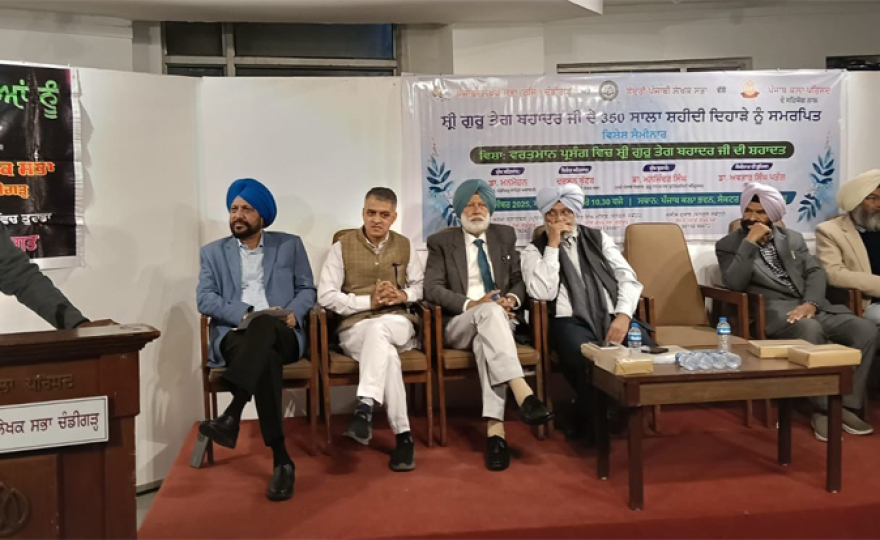 ਚੰਡੀਗੜ੍ਹ : ਪੰਜਾਬੀ ਲੇਖਕ ਸਭਾ ਚੰਡੀਗੜ੍ਹ ਅਤੇ ਕੇਂਦਰੀ ਪੰਜਾਬੀ ਲੇਖਕ ਸਭਾ ਵੱਲੋਂ ਪੰਜਾਬ ਕਲਾ ਪ੍ਰੀਸ਼ਦ ਦੇ ਸਹਿਯੋਗ ਨਾਲ ਪੰਜਾਬ ਕਲਾ ਭਵਨ ਚੰਡੀਗੜ੍ਹ ਵਿਖੇ ਸ੍ਰੀ ਗੁਰੂ ਤੇਗ ਬਹਾਦਰ ਜੀ ਦੇ 350 ਸਾਲਾ ਸ਼ਹੀਦੀ ਦਿਹਾੜੇ ਨੂੰ ਸਮਰਪਿਤ ਵਿਸ਼ੇਸ਼ ਸੈਮੀਨਾਰ ਕਰਵਾਇਆ ਗਿਆ ਜਿਸ ਵਿੱਚ ਵਰਤਮਾਨ ਪ੍ਰਸੰਗ ਵਿੱਚ ਗੁਰੂ ਜੀ ਦੀ ਸ਼ਹਾਦਤ ਵਿਸ਼ੇ ਤੇ ਬੁੱਧੀਜੀਵੀਆਂ ਨੇ ਆਪਣੇ ਵਿਚਾਰ ਸਾਂਝੇ ਕੀਤੇ |