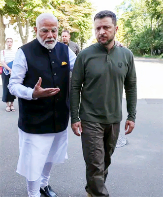 ਰੂਸ ਅਤੇ ਯੂਕਰੇਨ ਵਿਚਾਲੇ ਢਾਈ ਸਾਲਾਂ ਤੋਂ ਚੱਲ ਰਹੀ ਜੰਗ ਦੌਰਾਨ ਭਾਰਤ ਦੇ ਪ੍ਰਧਾਨ ਮੰਤਰੀ ਨਰਿੰਦਰ ਮੋਦੀ ਅੱਜ ਸ਼ੁੱਕਰਵਾਰ ਨੂੰ ਯੂਕਰੇਨ ਪਹੁੰਚੇ। ਉਥੇ ਉਨ੍ਹਾਂ ਨੇ ਯੂਕਰੇਨ ਦੇ ਰਾਸ਼ਟਰਪਤੀ ਵਲਾਦੀਮੀਰ ਜੇਲੈਂਸਕੀ ਨਾਲ ਮੁਲਾਕਾਤ ਕੀਤੀ ਹੈ। ਇਹ ਦੋਵੇਂ ਆਗੂ ਯੂਕਰੇਨ ਨੈਸ਼ਨਲ ਮਿਊਜੀਅਮ ਵੀ ਪਹੁੰਚੇ, ਜਿੱਥੇ ਉਨ੍ਹਾਂ ਨੇ ਜੰਗ ਦੌਰਾਨ ਜਾਨ ਗੁਆਉਣ ਵਾਲੇ ਬੱਚਿਆਂ ਨੂੰ ਸ਼ਰਧਾਂਜਲੀ ਦਿੱਤੀ। ਧਿਆਨ ਰਹੇ ਕਿ ਪੀਐਮ ਮੋਦੀ ਪੋਲੈਂਡ ਤੋਂ ਟਰੇਨ ਰਾਹੀਂ ਯੂਕਰੇਨ ਦੀ ਰਾਜਧਾਨੀ ਕੀਵ ਪਹੁੰਚੇ ਹਨ। ਜਿੱਥੇ ਭਾਰਤੀ ਭਾਈਚਾਰੇ ਦੇ ਲੋਕਾਂ ਨੇ ਉਨ੍ਹਾਂ ਦਾ ਭਰਵਾਂ ਸਵਾਗਤ ਕੀਤਾ। ਯੂਕਰੇਨ ਦੌਰੇ ’ਤੇ ਜਾਣ ਵਾਲੇ ਪੀਐਮ ਮੋਦੀ ਪਹਿਲੇ ਭਾਰਤੀ ਪ੍ਰਧਾਨ ਮੰਤਰੀ ਹਨ। ਪੀਐਮ ਮੋਦੀ ਅਤੇ ਯੂਕਰੇਨ ਦੇ ਰਾਸ਼ਟਰਪਤੀ ਜੇਲੈਂਸਕੀ ਨੇ ਕਈ ਅਹਿਮ ਮੁੱਦਿਆਂ ’ਤੇ ਗੱਲਬਾਤ ਵੀ ਕੀਤੀ ਹੈ।