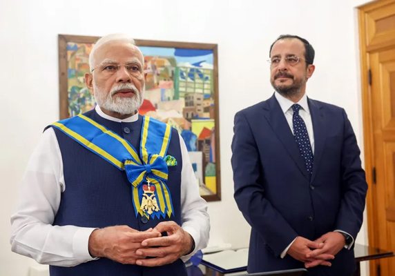 ਪ੍ਰਧਾਨ ਮੰਤਰੀ ਨਰਿੰਦਰ ਮੋਦੀ ਨੂੰ ਸਾਈਪ੍ਰਸ ਦਾ ਸਰਵਉੱਚ ਸਨਮਾਨ ਦਿੱਤਾ ਗਿਆ ਹੈ। ਸਾਈਪ੍ਰਸ ਦੇ ਰਾਸ਼ਟਰਪਤੀ ਨਿਕੋਸ ਕਿ੍ਰਸਟੋ ਡੂਲਾਈਡਜ਼ ਨੇ ਪ੍ਰਧਾਨ ਮੰਤਰੀ ਮੋਦੀ ਨੂੰ ਸਾਈਪ੍ਰਸ ਦਾ ਸਰਵਉੱਚ ਸਨਮਾਨ, ਗ੍ਰੈਂਡ ਕਰਾਸ ਆਫ ਦ ਆਰਡਰ ਆਫ਼ ਮਕਾਰੀਓਸ ਪ੍ਰਦਾਨ ਕੀਤਾ। ਆਰਡਰ ਆਫ ਮਕਾਰੀਓਸ ਸਾਈਪ੍ਰਸ ਦੁਆਰਾ ਦਿੱਤਾ ਗਿਆ ਇਕ ਨਾਈਟਹੁੱਡ ਸਨਮਾਨ ਹੈ, ਜਿਸ ਦਾ ਨਾਮ ਸਾਈਪ੍ਰਸ ਦੇ ਪਹਿਲੇ ਰਾਸ਼ਟਰਪਤੀ ਆਰਚਬਿਸ਼ਪ ਮਕਾਰੀਓਸ ਦੇ ਨਾਮ ’ਤੇ ਰੱਖਿਆ ਗਿਆ ਸੀ। ਇਸ ਮੌਕੇ ਪ੍ਰਧਾਨ ਮੰਤਰੀ ਮੋਦੀ ਨੇ ਕਿਹਾ ਕਿ ਸ਼੍ਰੀਮਾਨ ਰਾਸ਼ਟਰਪਤੀ, ਮੈਂ ਤੁਹਾਡਾ, ਸਾਈਪ੍ਰਸ ਸਰਕਾਰ ਅਤੇ ਸਾਈਪ੍ਰਸ ਦੇ ਲੋਕਾਂ ਦਾ ਗ੍ਰੈਂਡ ਕਰਾਸ ਆਫ਼ ਦ ਆਰਡਰ ਆਫ਼ ਮਕਾਰੀਓਸ ਸਨਮਾਨ ਲਈ ਦਿਲੋਂ ਧੰਨਵਾਦ ਕਰਦਾ ਹਾਂ। ਉਨ੍ਹਾਂ ਕਿਹਾ ਕਿ ਇਹ ਸਿਰਫ਼ ਨਰਿੰਦਰ ਮੋਦੀ ਲਈ ਹੀ ਨਹੀਂ, ਸਗੋਂ 140 ਕਰੋੜ ਭਾਰਤੀਆਂ ਲਈ ਹੈ।